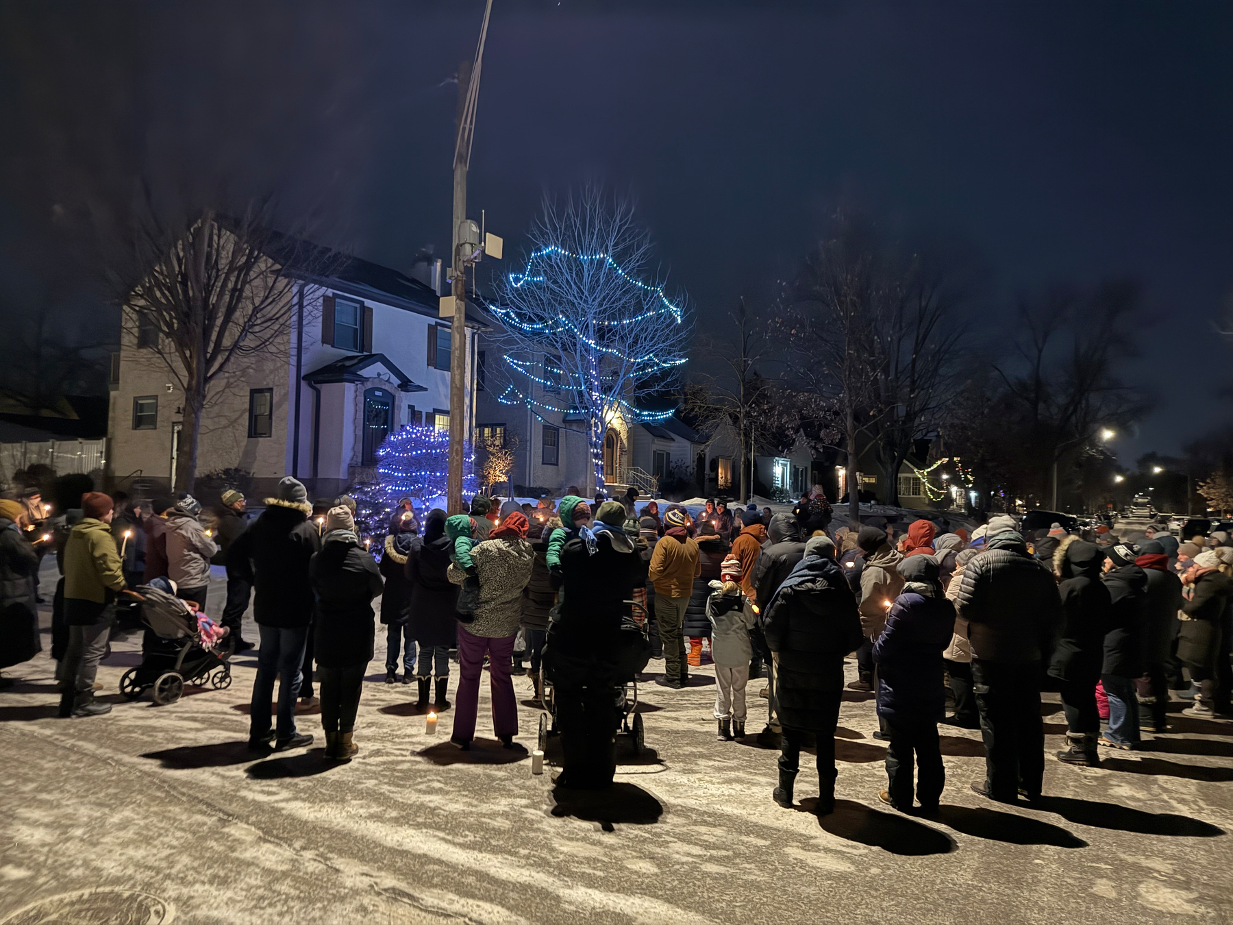 PS: The first picture I included is us at Yum a couple of days after the 20th anniversary of our first visit to Yum. Dad had wanted to go on Thursday which was the actual 20 year anniversary, but I didn’t remember that it was on the calendar and made dinner by mistake. I sort of felt like the anniversary wasn’t worth celebrating since you weren’t here, but dad was really into it. So on Saturday night we made our way there and dad took several pictures of the event. And as you can tell in the picture, I got eyelashes again. The second picture is of the vigil in our neighborhood on Saturday night. Dad and I went after dinner at Yum. It was very nice, small, peaceful and we sang lots of repeating songs including Peace Like A River. There were small gatherings all over the city.
